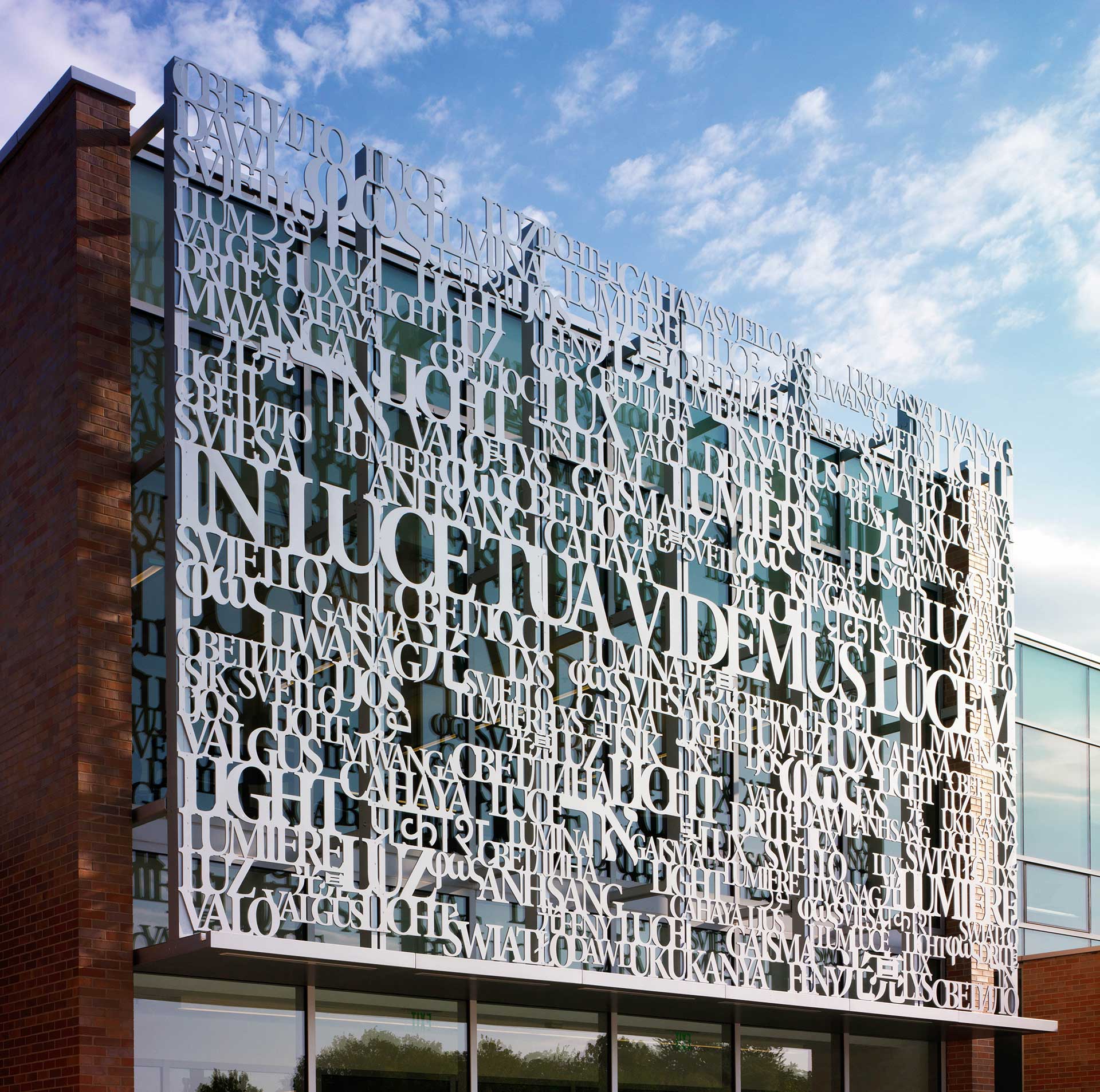 Valparaiso University’s College of Arts and Sciences received an Honorable Mention for Creative Detailing by the Metal Construction Association. Awards are based on overall appearance, significance of metal in the project, innovative use of metal and the role of metal in achieving project objectives. The College of Arts and Sciences features a digitally-fabricated screen above the building’s main entrance. The university’s motto “In Luce Tue Videmus Lucem” (In Thy Light, We See Light) was translated into 39 languages and incorporated into a lattice cut design out of aluminum plate.