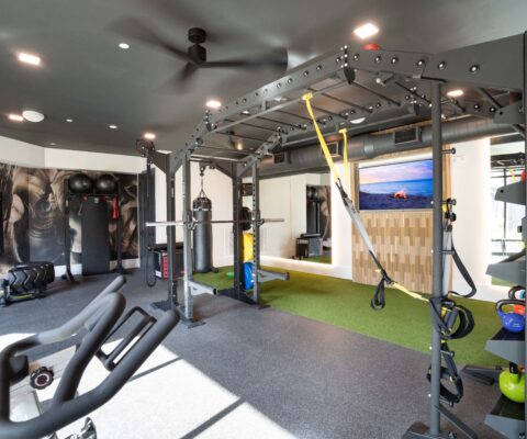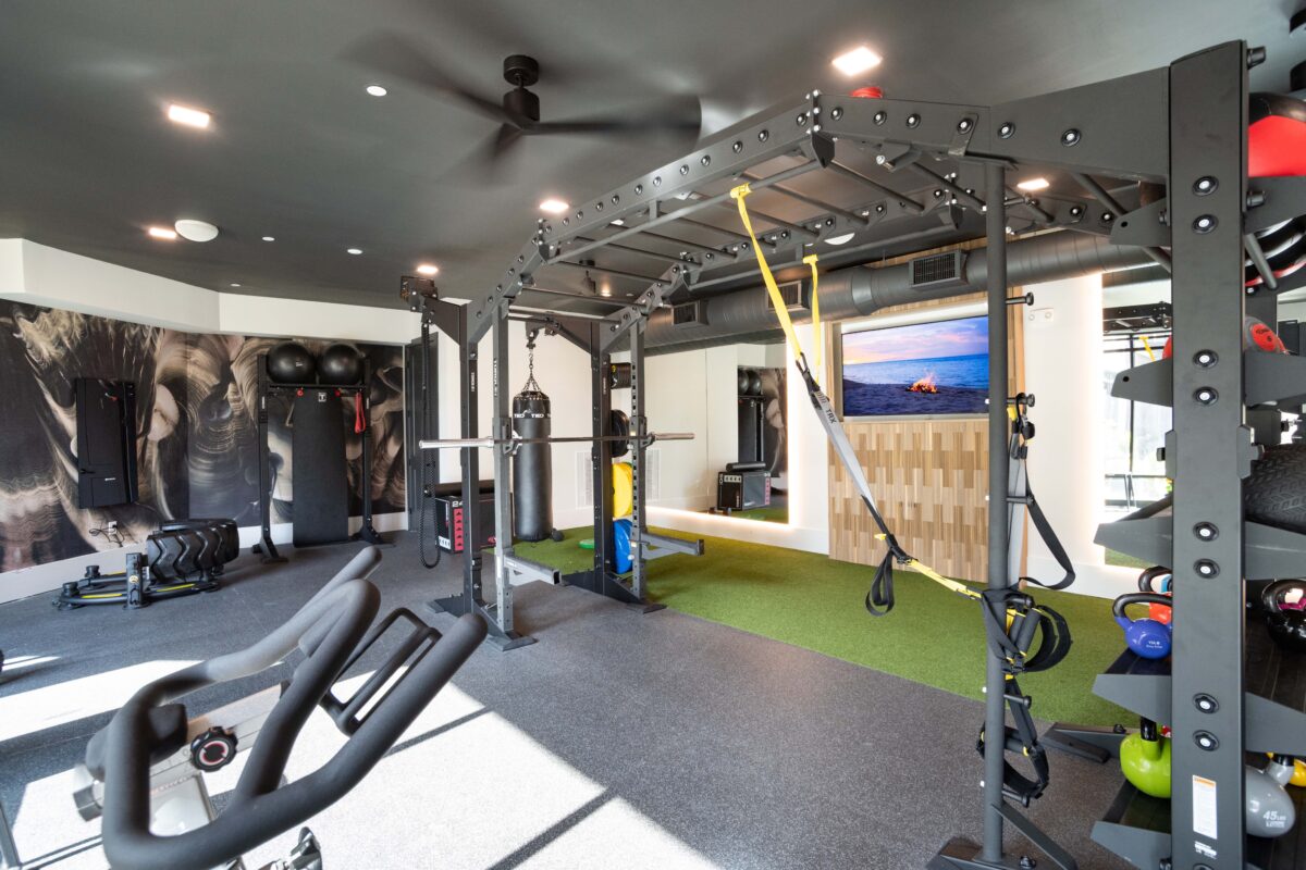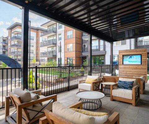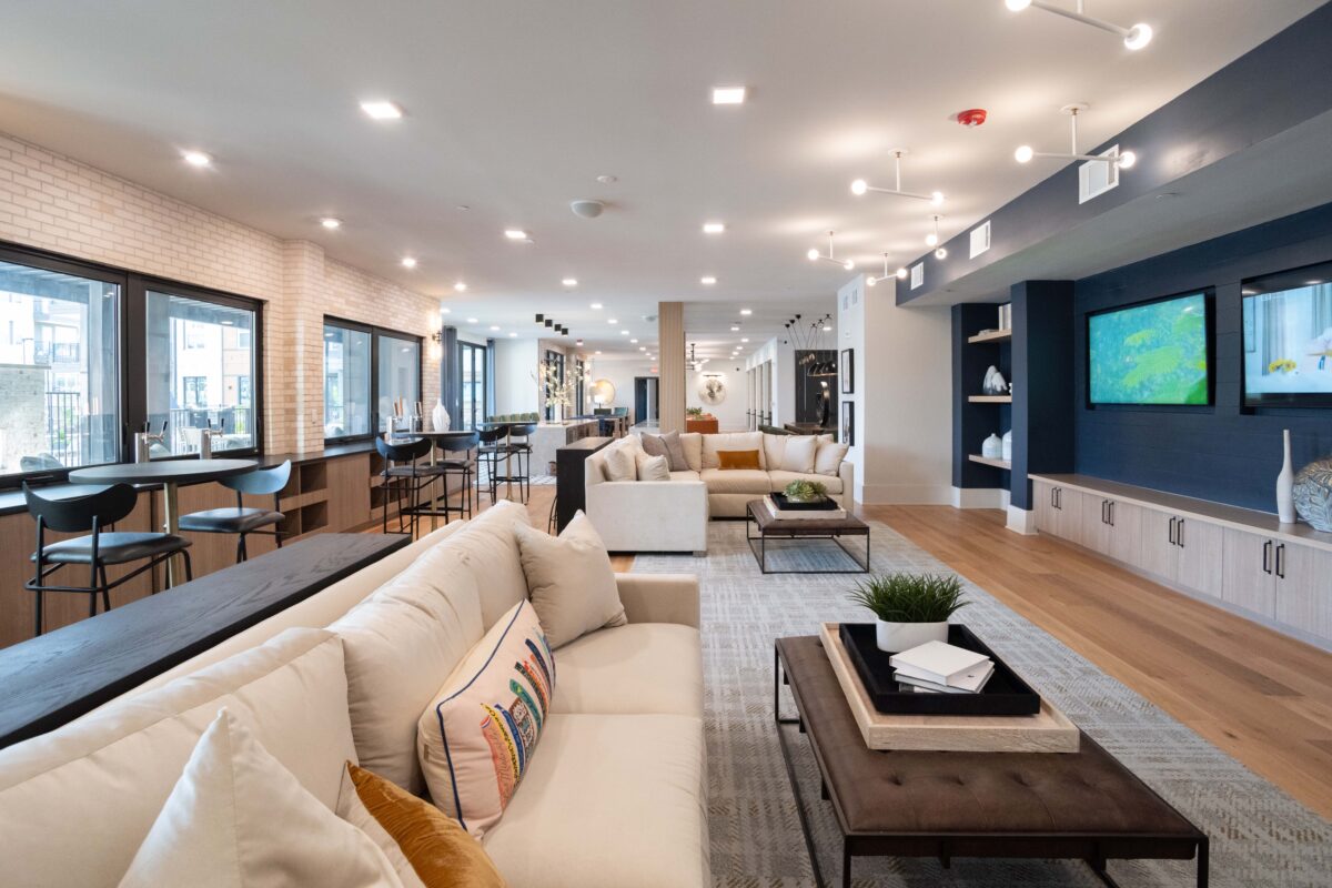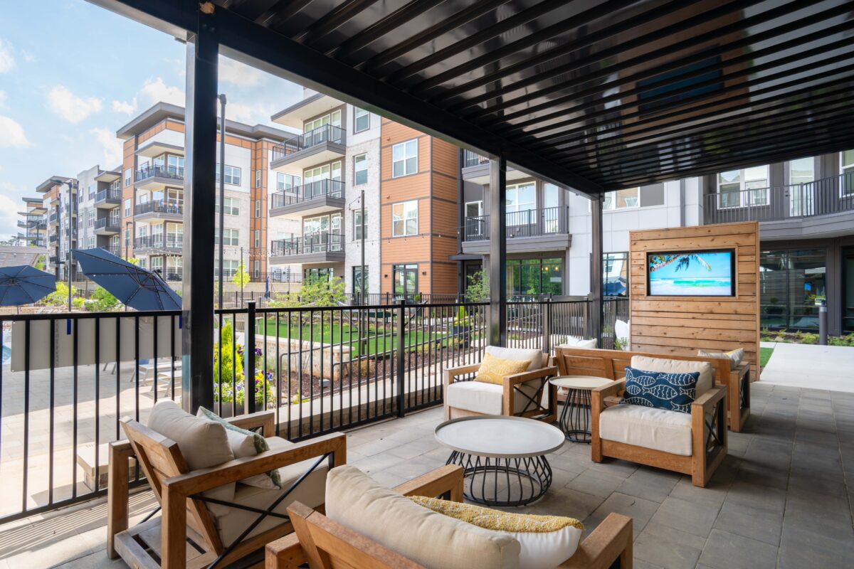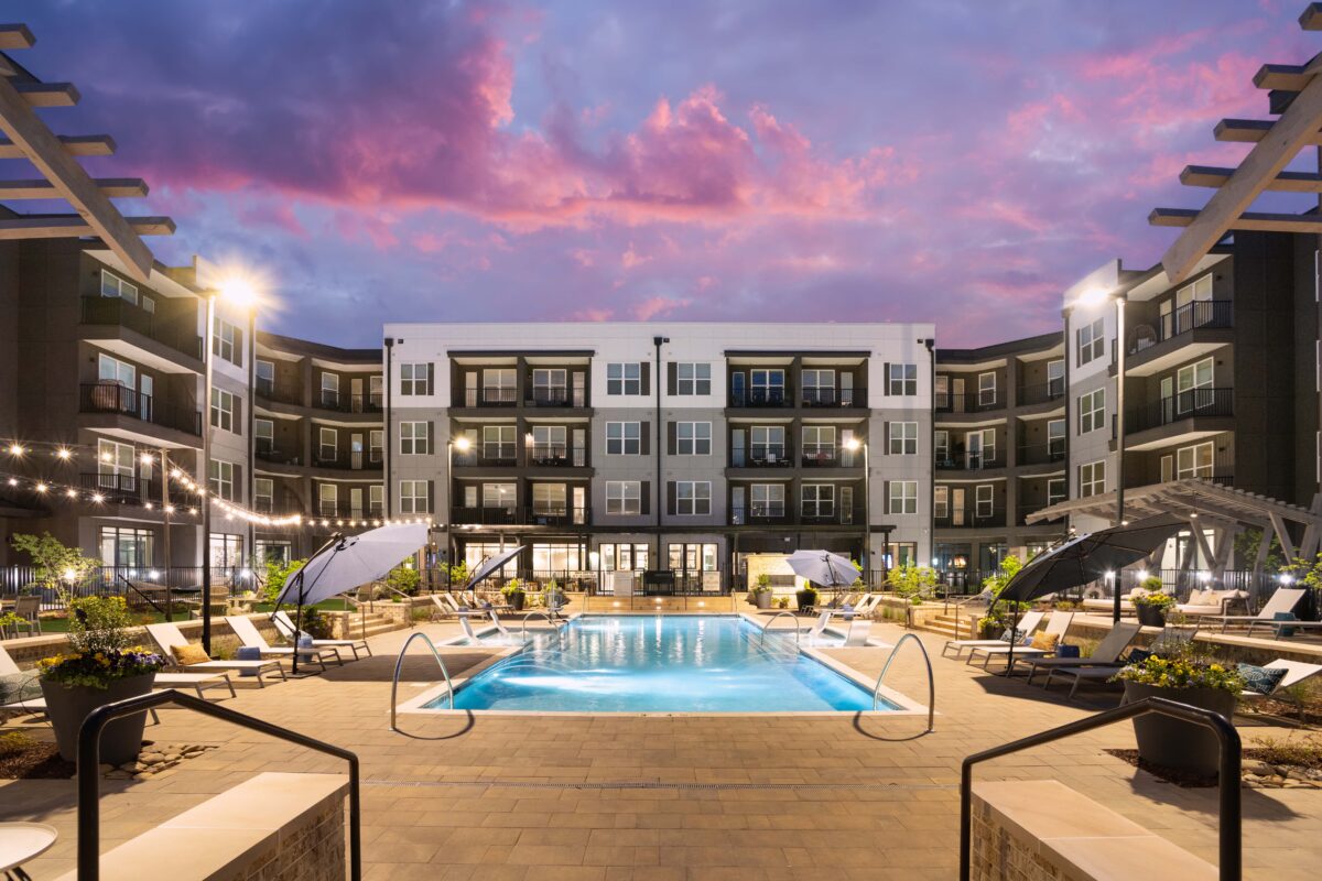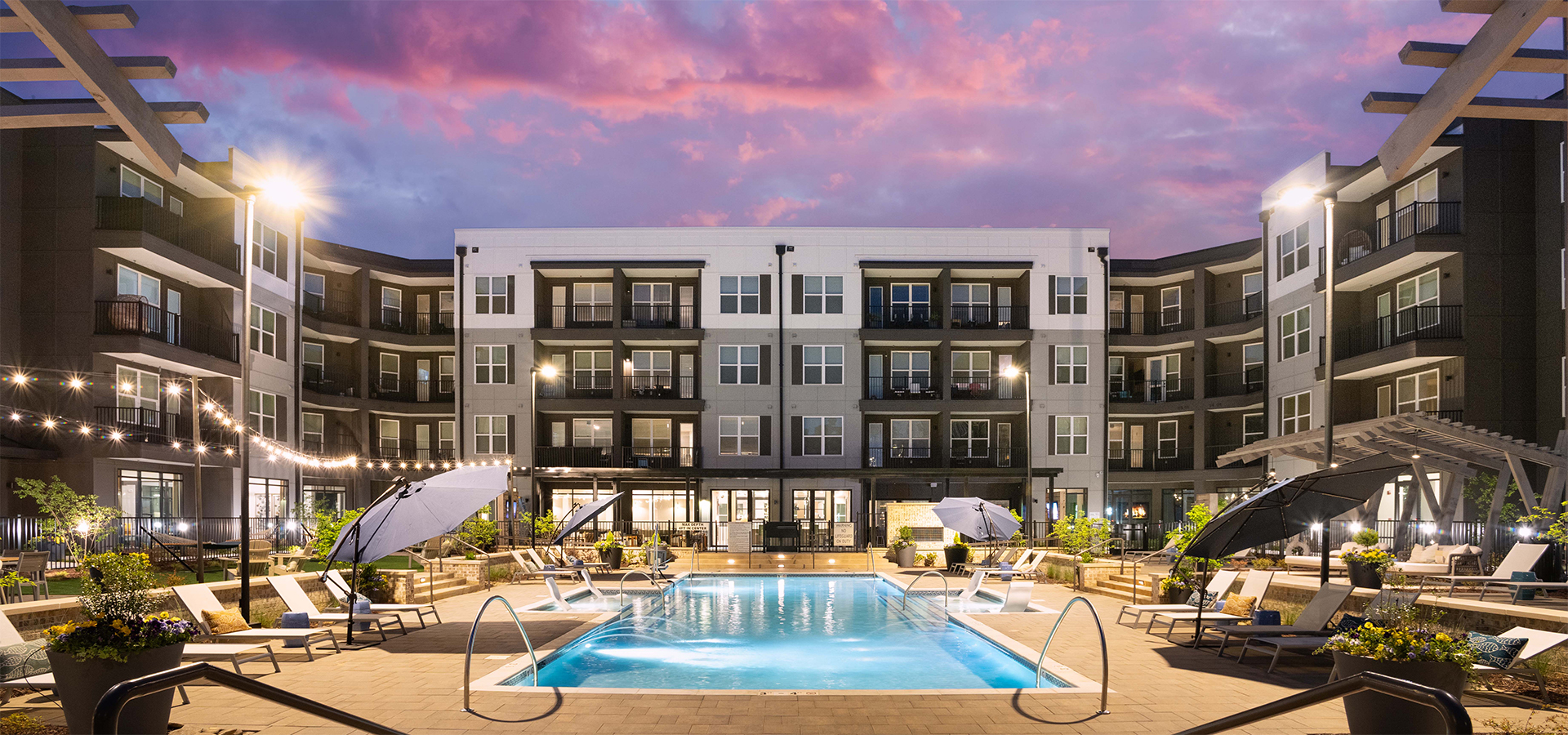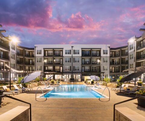 The property offers generous community amenities including a resident lounge with gaming and entertainment areas, a state-of-the-art fitness and wellness center, a co-working lounge with private workspaces and conference rooms, a hobby and art studio, and a market. Outside, tenants can also enjoy a heated resort-style pool, courtyards with fire pits, gaming, grills, and hammocks, and expansive green space. Pet owners can take advantage of a dog park and pet spa. The site offers four freestanding garage buildings as well as surface parking and electric vehicle charging stations.