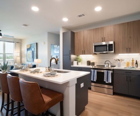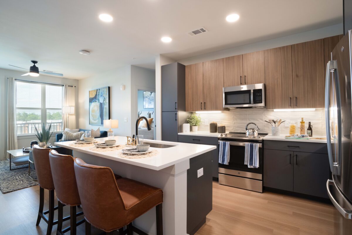 Offered in one- to three-bedroom floor plans, units boast high-end finishes including luxury vinyl tile flooring, quartz countertops, and stainless steel appliances. Select units offer private balconies or patios, flex den/office space, and mudroom storage areas. The townhome units offer attached garages that are pre-wired for electric vehicle charging. Additionally, 10 units contain a downstairs workspace in which residents can have an office or small storefront.