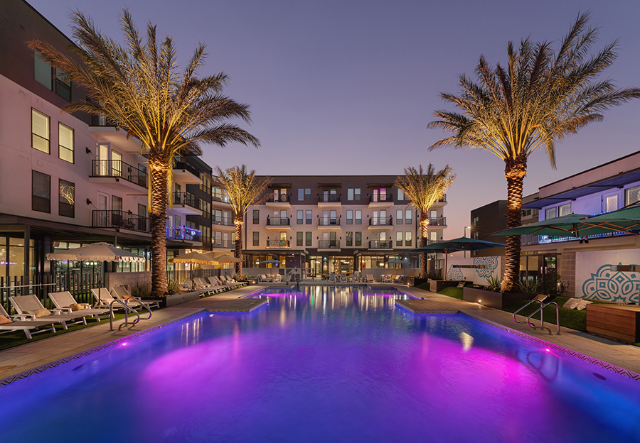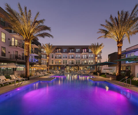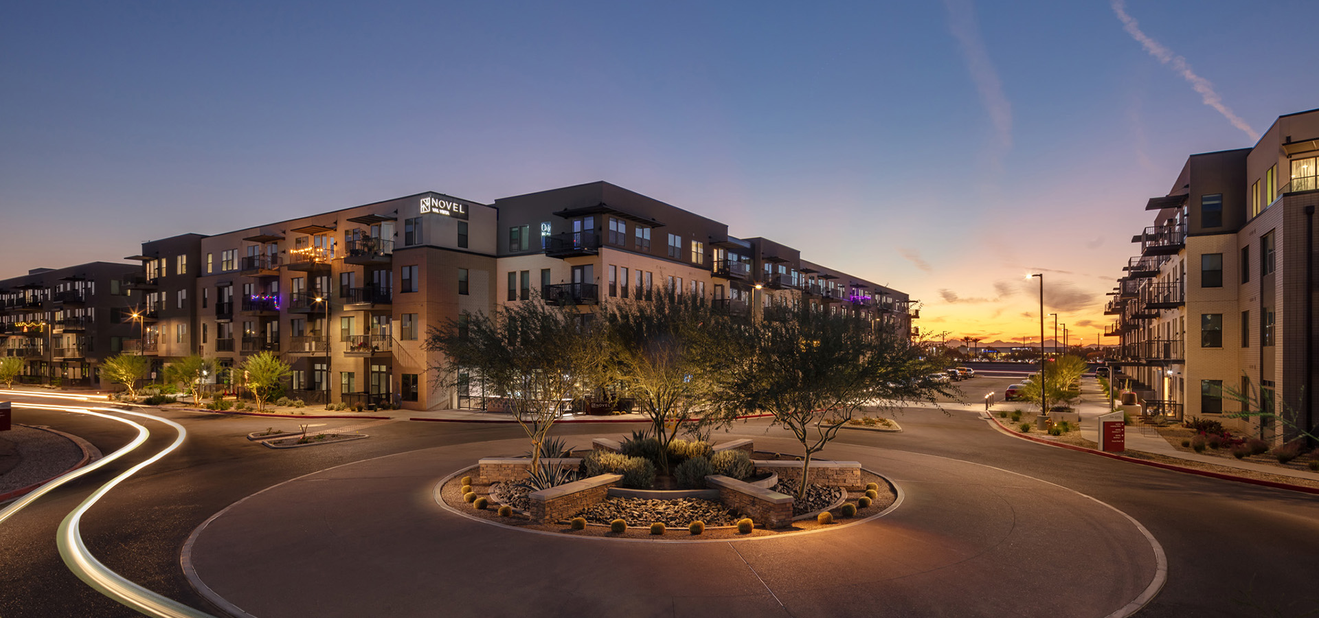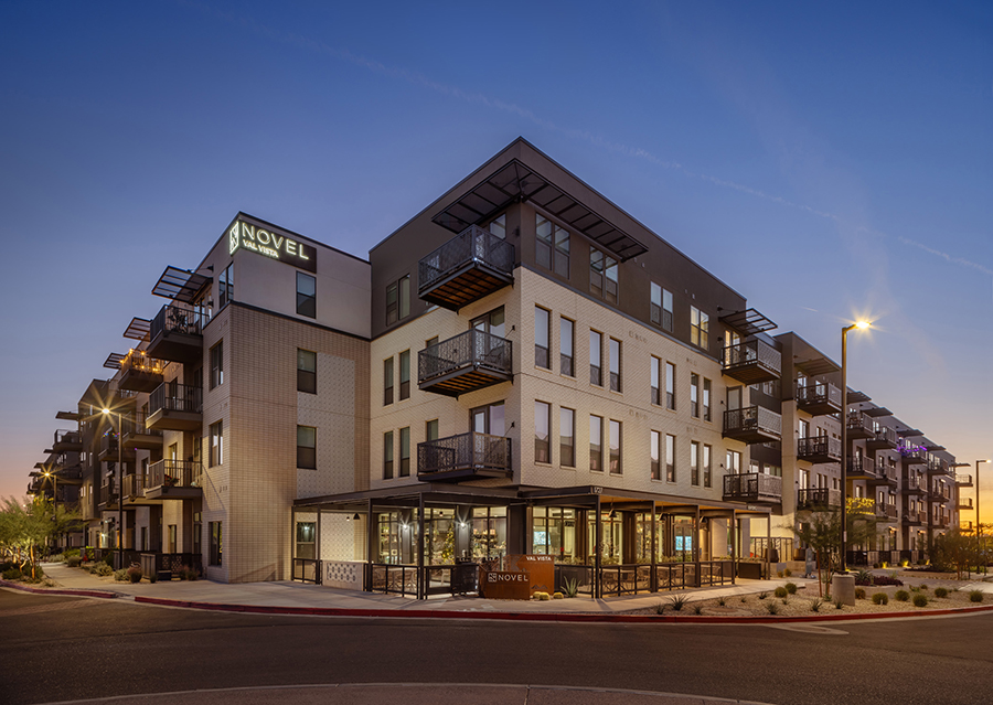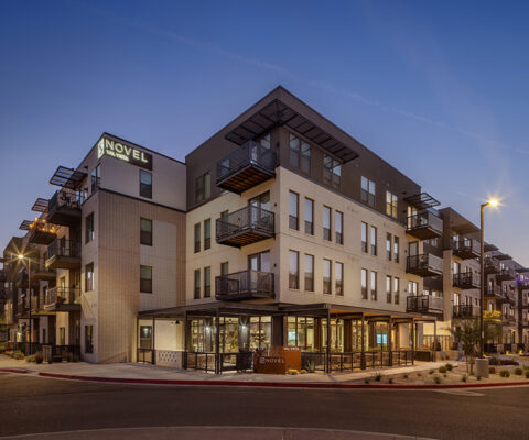 NOVEL Val Vista is a 317-unit multi-family development in Gilbert, Arizona. McShane constructed three four-story garden-style buildings and three two-story carriage house buildings, along with 11,500 square feet of amenity space. The garden-style buildings feature stucco and brick exteriors, and the carriage houses integrate fiber cement board and corrugated metal panels.