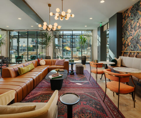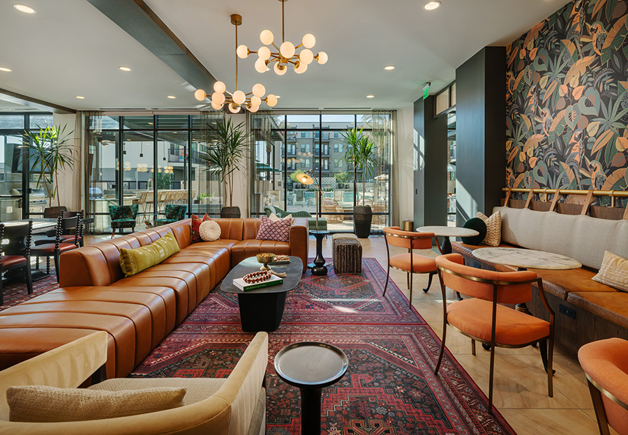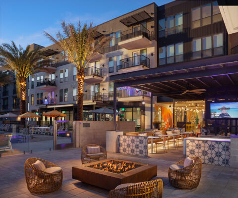 Residents can enjoy an array of amenities including a fitness club, sky lounge, clubhouse, and game room. Outdoor amenities include a dog park, resort-style swimming pool, kitchen with a pizza oven, workspaces, fireplaces, and fire pits.
