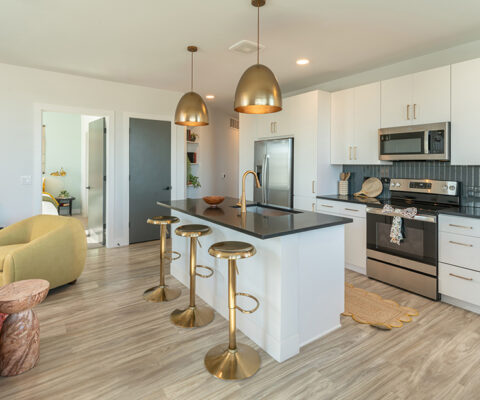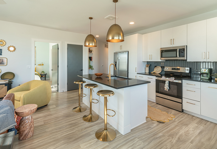 Units are offered in studio, one-, and two-bedroom layouts. The apartments boast black quartz countertops, modern white cabinetry, and stainless-steel Energy Star appliances in the kitchens, luxury vinyl-tile flooring in the common areas, and spacious carpeted bedrooms.