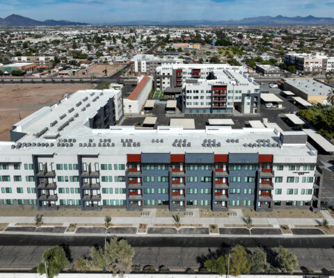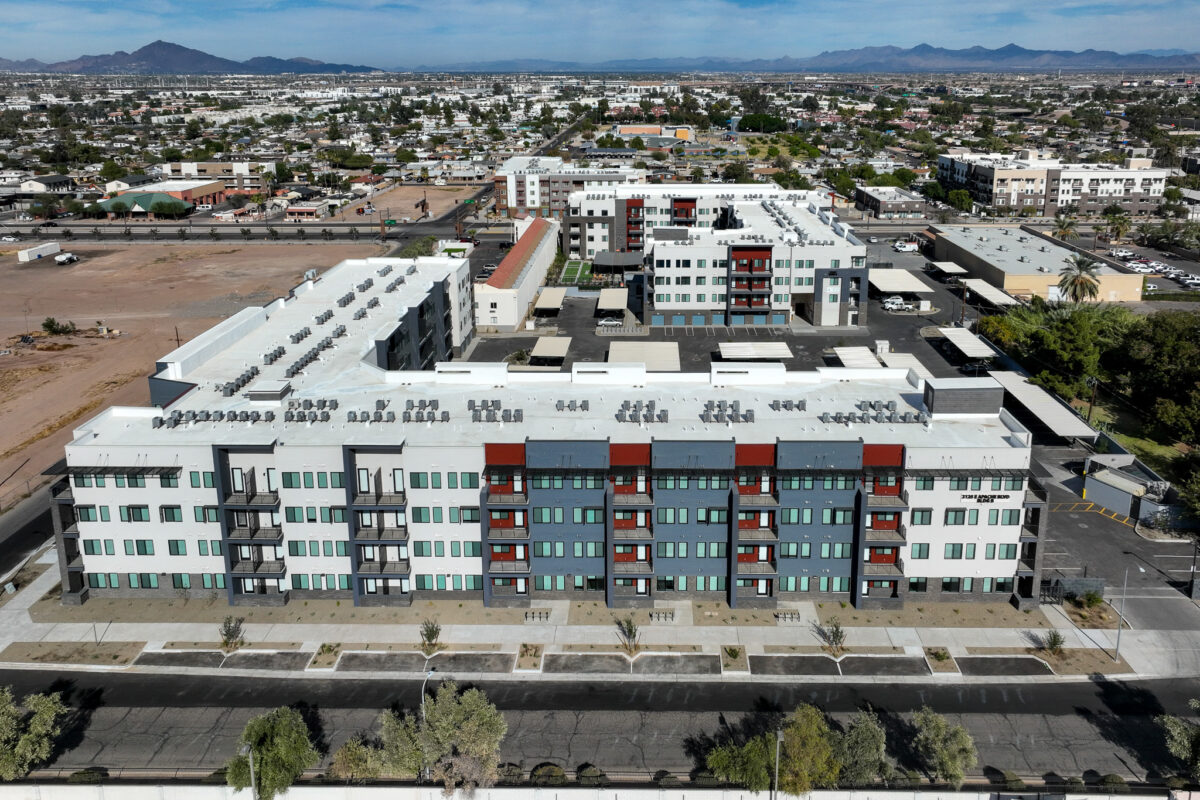 With designs inspired by the Arizonian desert landscape, apartments are offered in studio, one-, and two-bedroom floorplans. The open-concept apartments feature eat-in kitchens with large islands, quartz countertops, and stainless-steel energy-efficient appliances. Units also incorporate large kitchen islands, quartz countertops, nine-foot ceilings, tile shower surrounds, and in-unit washers and dryers. Additionally, there are five live-work spaces with their own street-front entrances, perfect for microbusinesses and entrepreneurs.