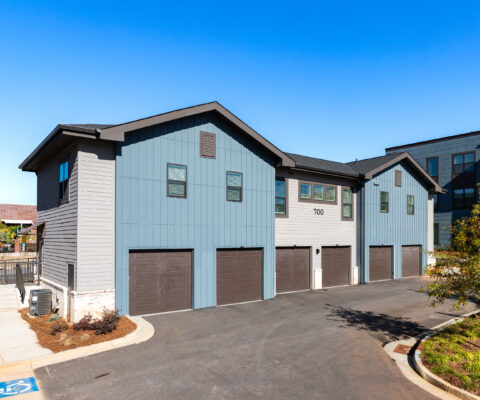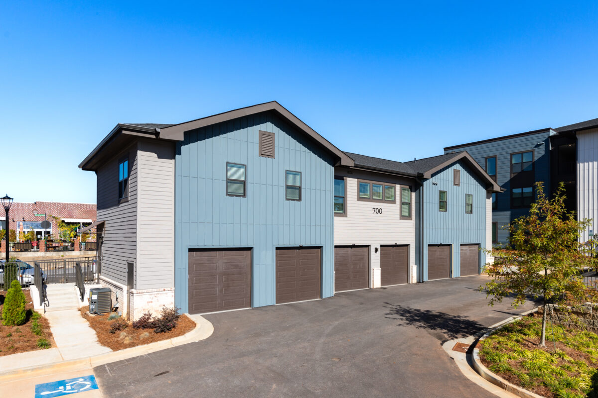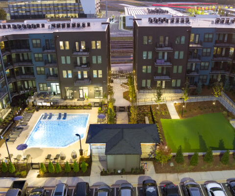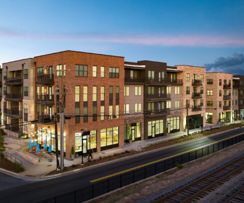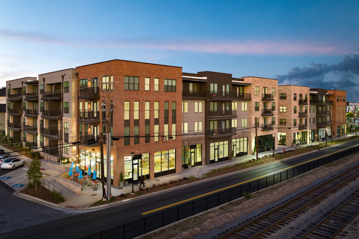 Signal is a mixed-use community in Hapeville, Georgia, that integrates 285 luxury apartment units and 4,392 square feet of ground-floor retail space. The development incorporates seven buildings including two four-story podium-style buildings, three three- and four-story wood-framed buildings, and two carriage house buildings. The buildings’ exteriors are designed around a dark color palette using bronze vinyl windows, bronze storefront, and a brick veneer and siding finish.