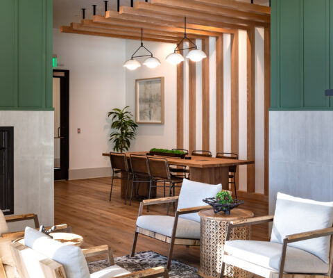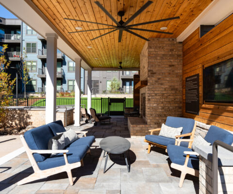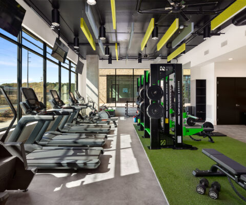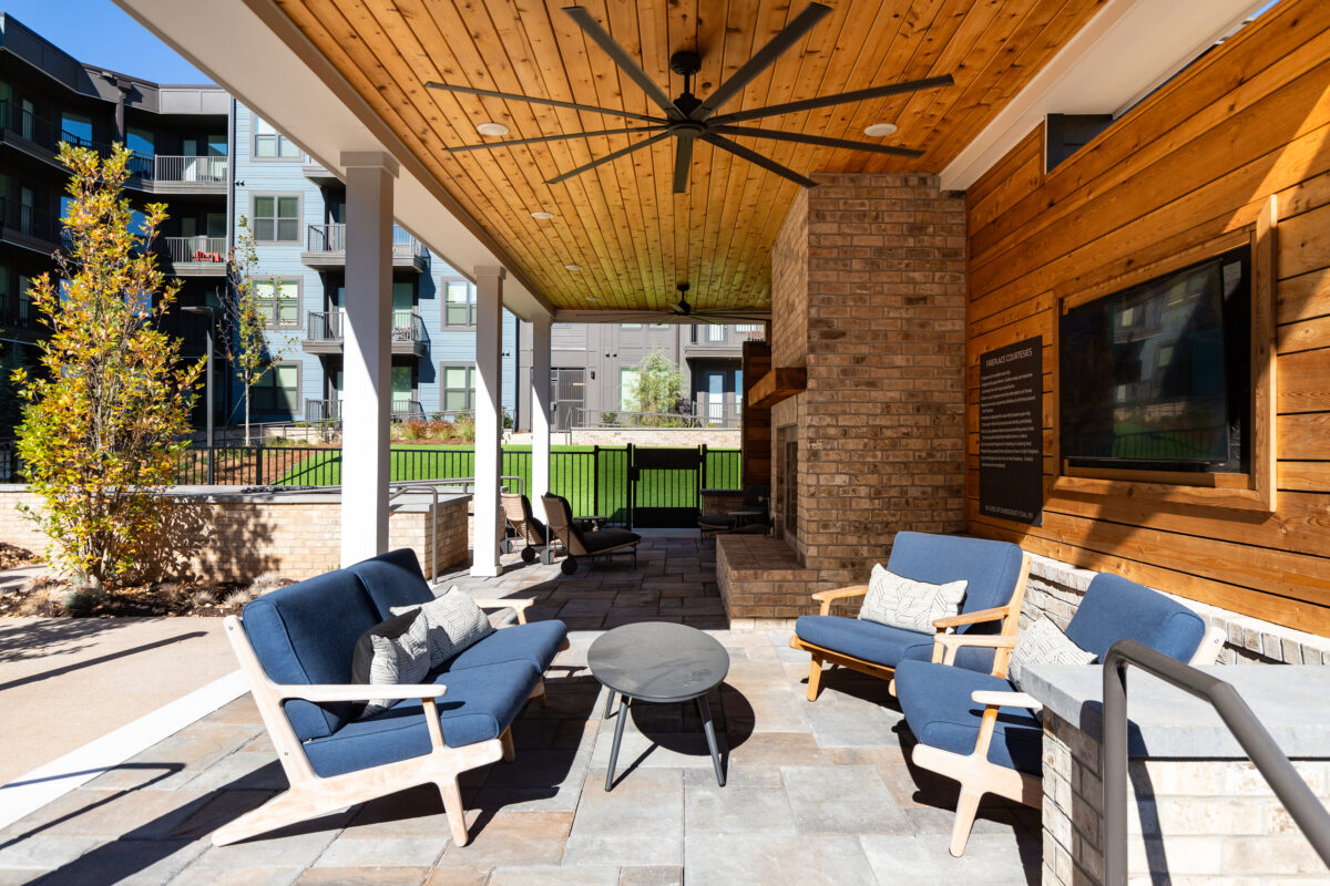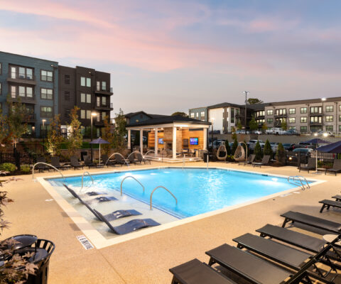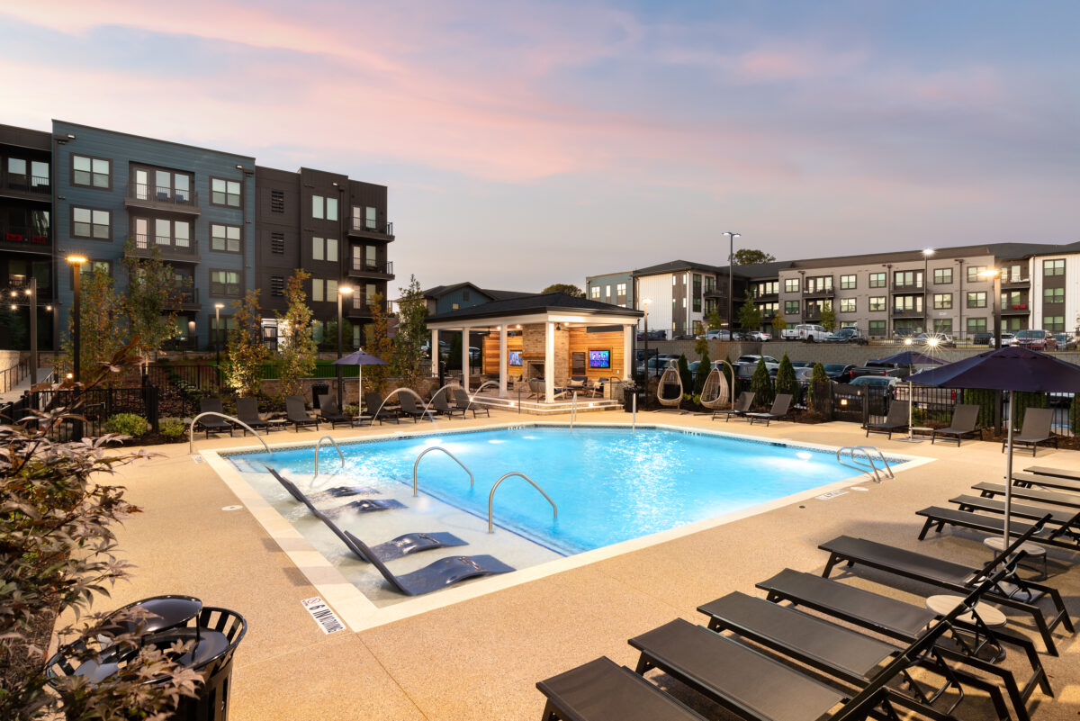 The property boasts more than 7,000 square feet of best-in-class amenities. A multimedia club room integrates a chef-inspired demonstration kitchen, billiards, and a lounge. The state-of-the-art fitness center features smart bikes, free weights, and a yoga studio. Outside, residents can enjoy the saltwater swimming pool, lounge by the firepits, or cook at the pizza oven and gas grills. The pet-friendly community offers both a pet spa and an outdoor dog park. Additional amenities include a coffee bar, private work offices, and collaboration spaces.