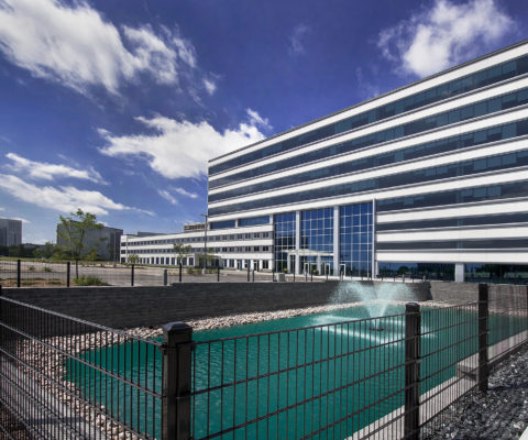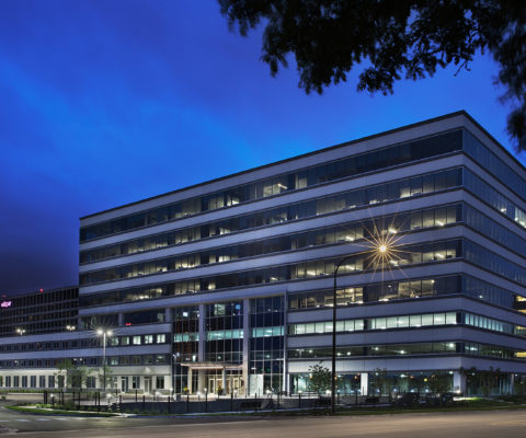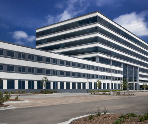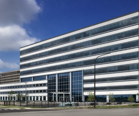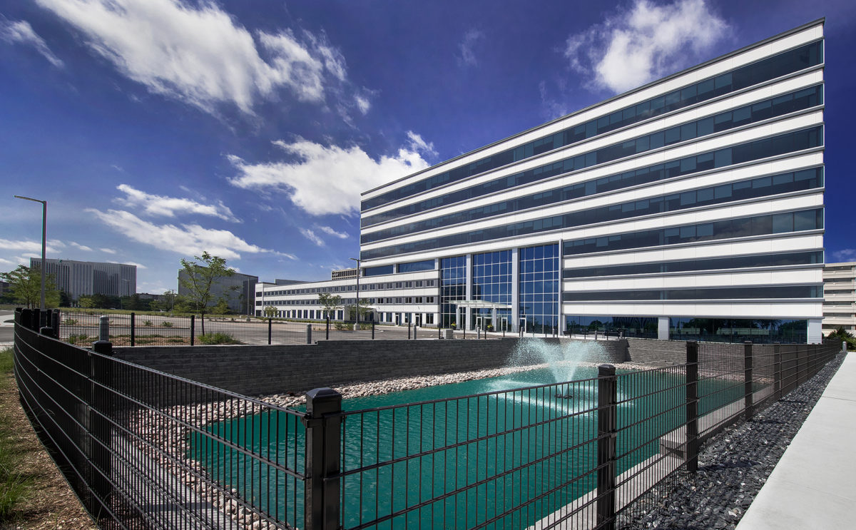 The eight-story office facility was constructed on a greenfield site near O’Hare International Airport and features precast concrete construction with ribbon windows on top of a four-foot mat foundation. The first three floors and partial fourth floor of the building encompass structured parking with floors five through eight featuring open office areas. The total parking count for the development is 628 spaces.