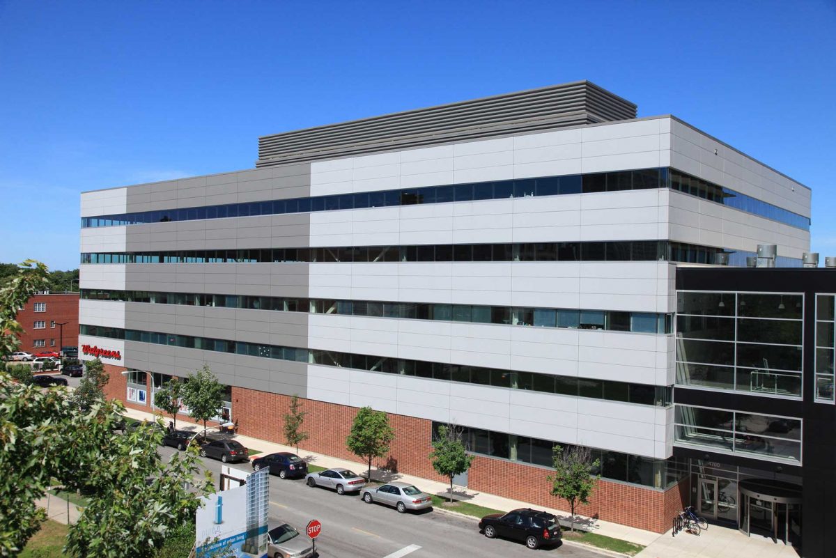 The exterior of the medical facility features metal panels and storefront windows providing extensive ambient light throughout the facility. Brick accents are featured around the first level of the building.