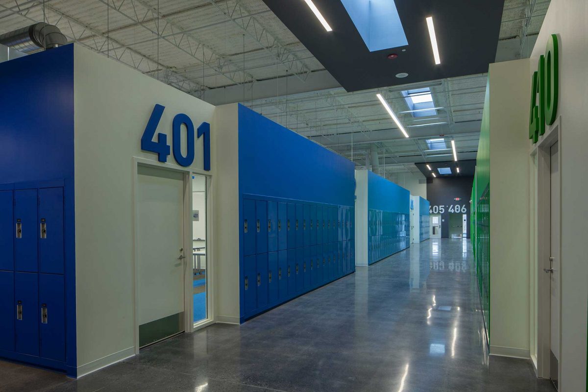 The exterior of the single-story 115,300-square-foot facility was modified to a more contemporary look that included CMU block masonry, exterior wall reinforcement, aluminum windows, a new aluminum curtainwall and partial roof replacement featuring 29 skylights to enhance natural light.
