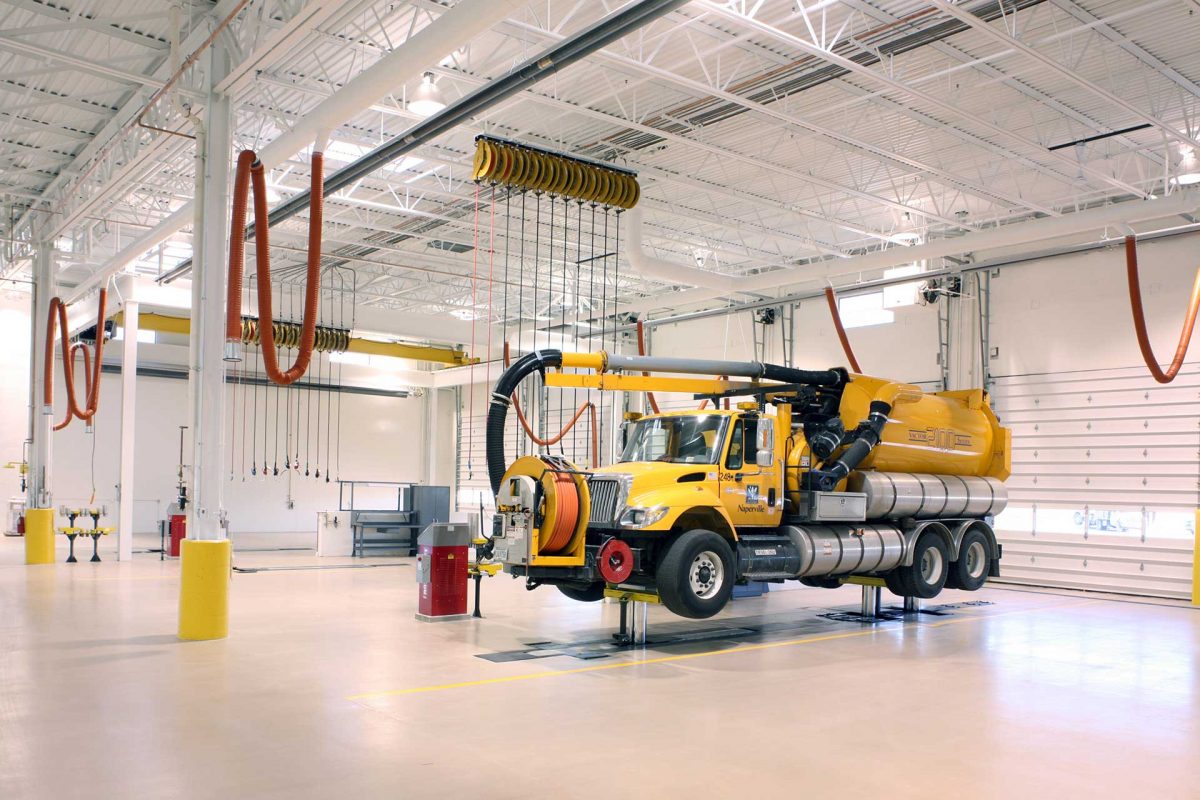The service center was constructed with precast panels and features a curved roof and clerestory space above the roofline of the reception area and the employee entrance.