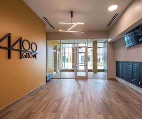 The four-story development features precast podium construction with the third and fourth floors utilizing cold formed steel studs. 4400 Grove will feature a masonry and Hardie panel exterior.