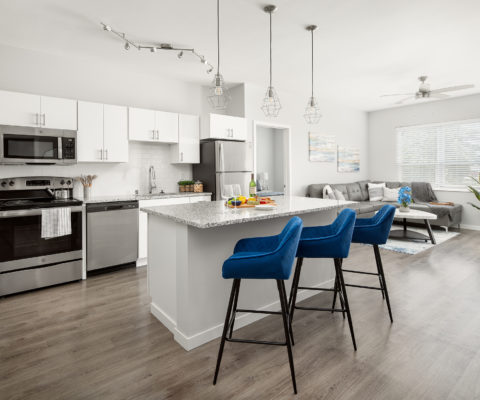 Each unit features luxury vinyl plank flooring, white cabinets, granite countertops, a tiled backsplash and stainless steel appliances.