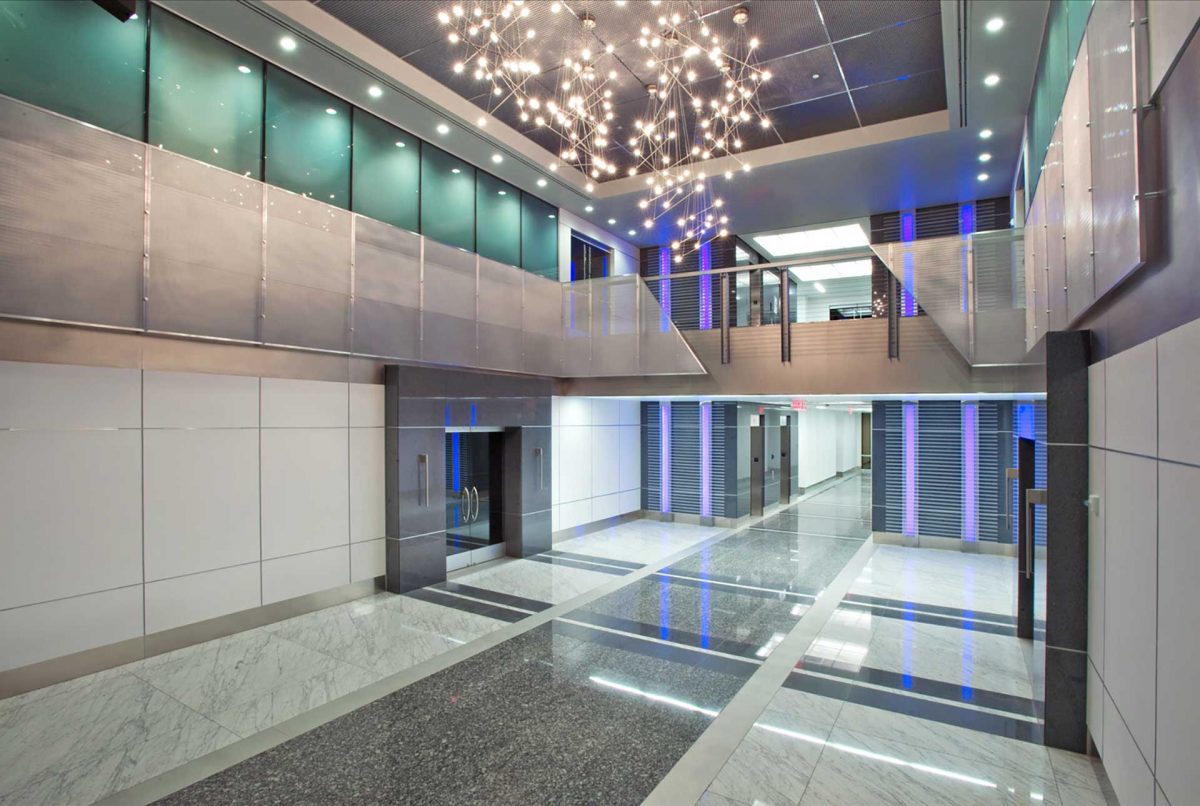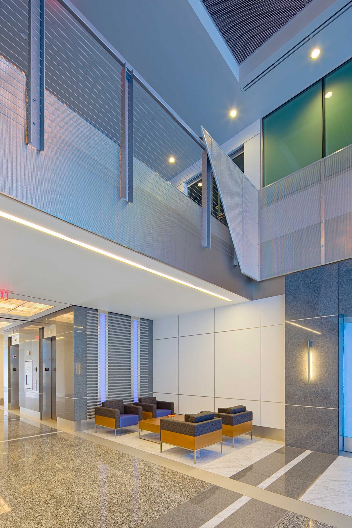 A two-story atrium with ample window lines highlights an attractive lobby for the multi-tenant reception area.