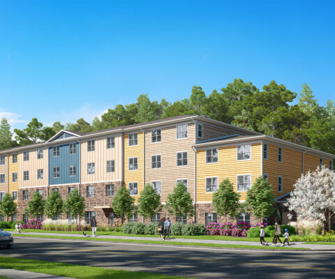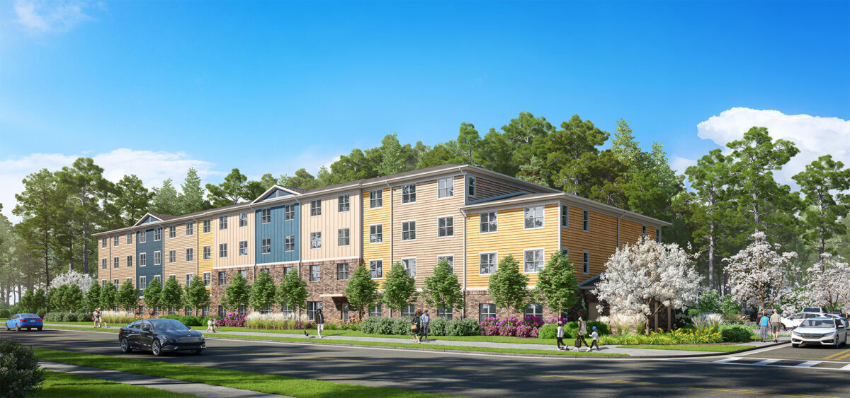Crossing Pointe is an 80-unit affordable senior living community under construction in Union City, Georgia. Each unit features one bedroom and one bathroom, solid surface countertops and black appliances in the kitchen, zero threshold showers, and luxury vinyl plank flooring throughout. Amenities include a community room with a warming kitchen, laundry room, mail room, computer center, and fitness room.