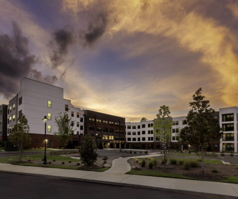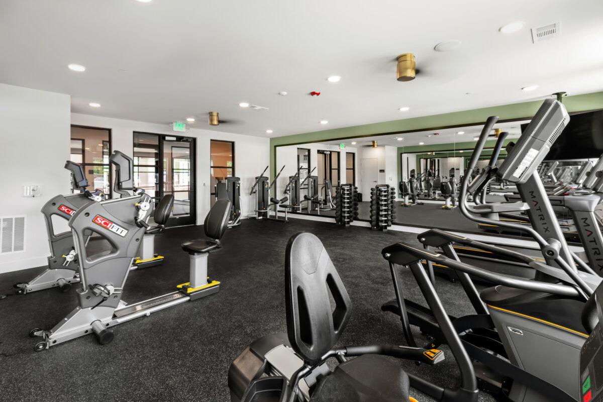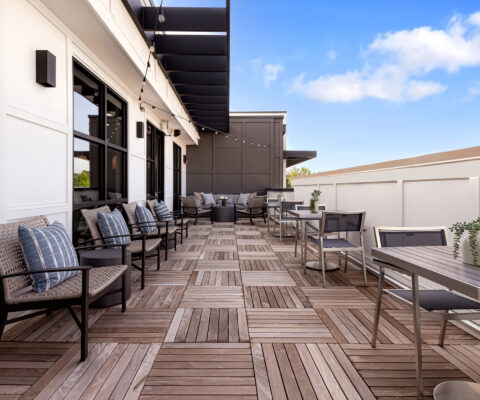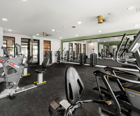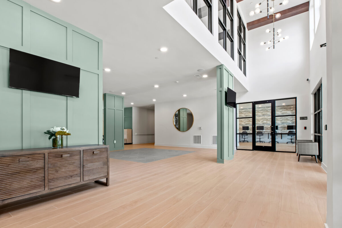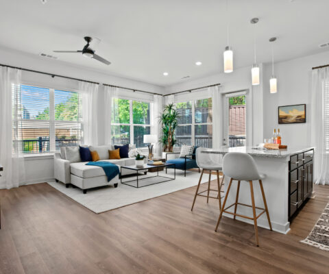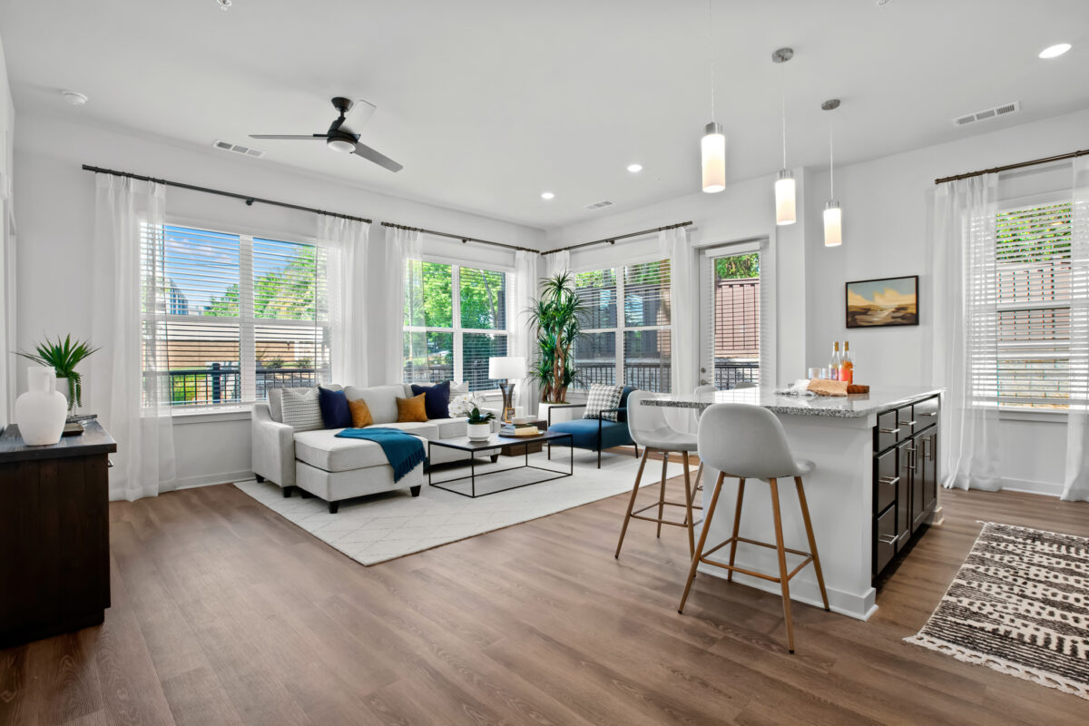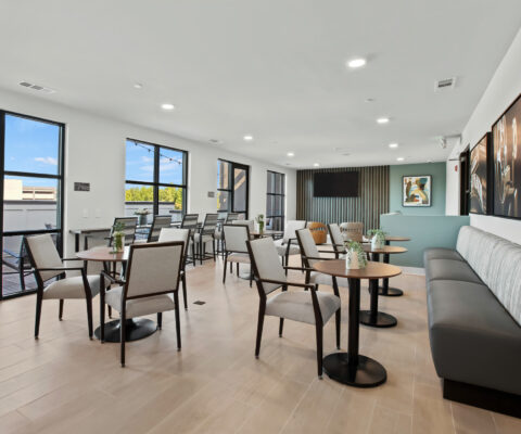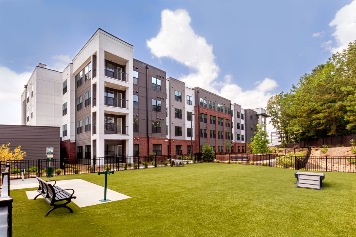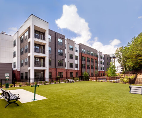 Community amenities include a bistro/café, fitness room, yoga room, fourth-floor outdoor terrace, and dog park. Units are offered in one- and two-bedroom floorplans and feature granite countertops, kitchen islands, Energy-Star kitchen appliance packages, nine-foot ceilings, and luxury vinyl-tile flooring.