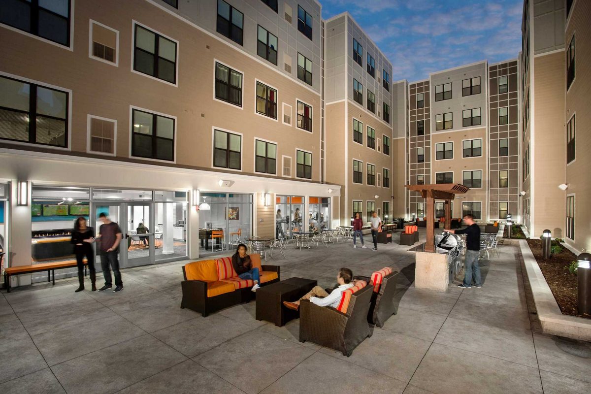 The podium style complex features a two-story, below-grade parking component and numerous tenant amenities, including a computer lounge, bike storage, an outdoor courtyard with gathering areas and a fitness center.