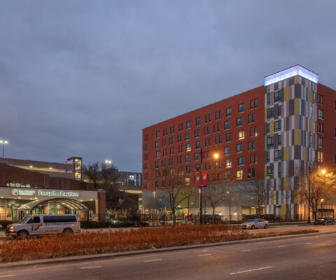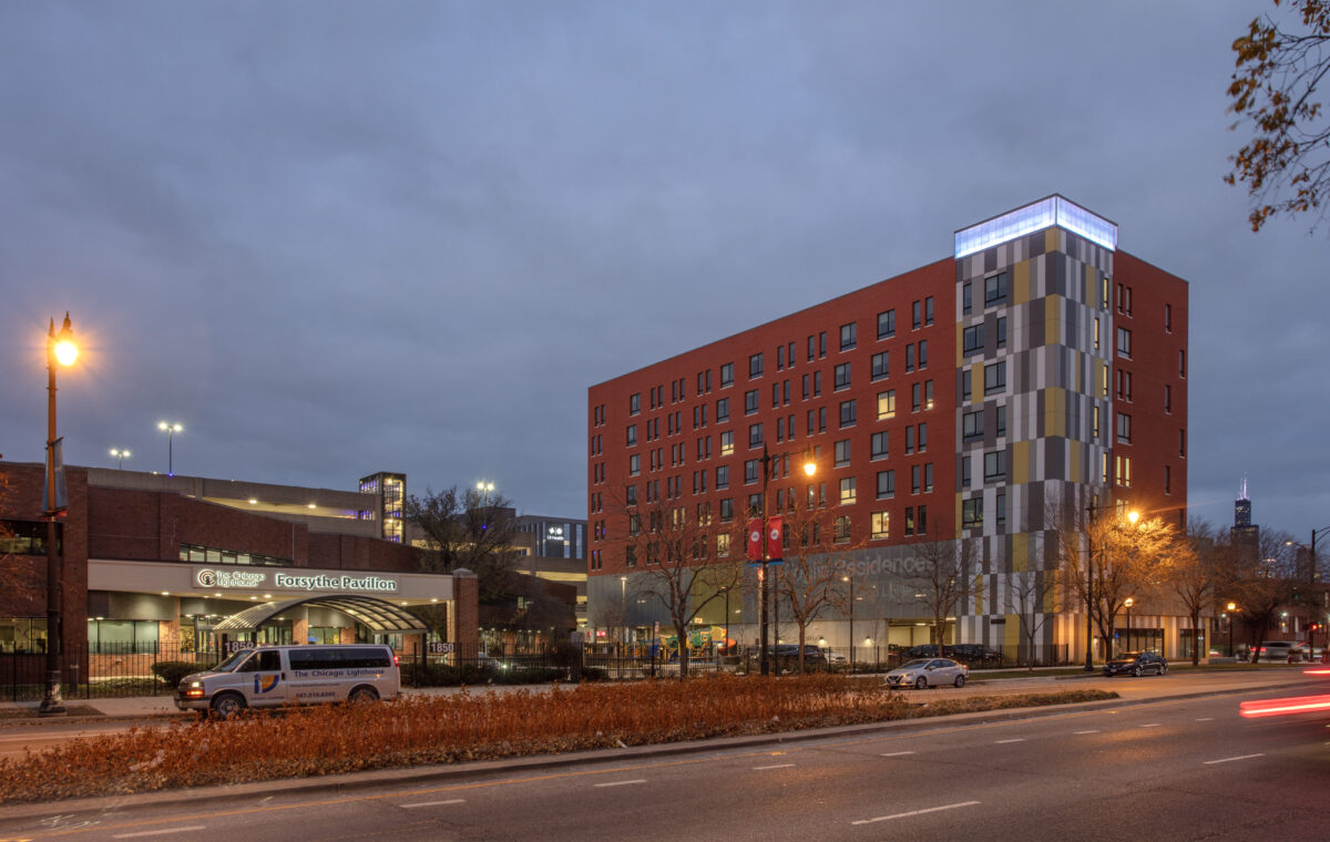 Situated on a site adjacent to The Chicago Lighthouse’s center in the Illinois Medical District, the podium-style building features nine stories with three levels of parking, six levels of units, and first-floor retail space. The exterior integrates a mix of perforated metal panels, brick veneer, and fiber cement siding. At roof level, back-lit translucent panels symbolize a lighthouse.