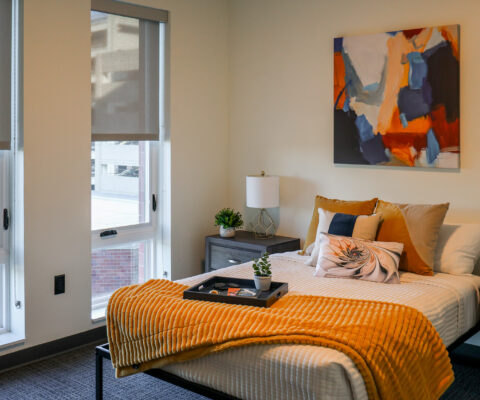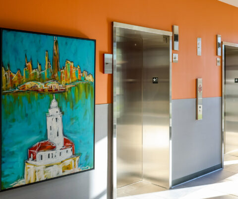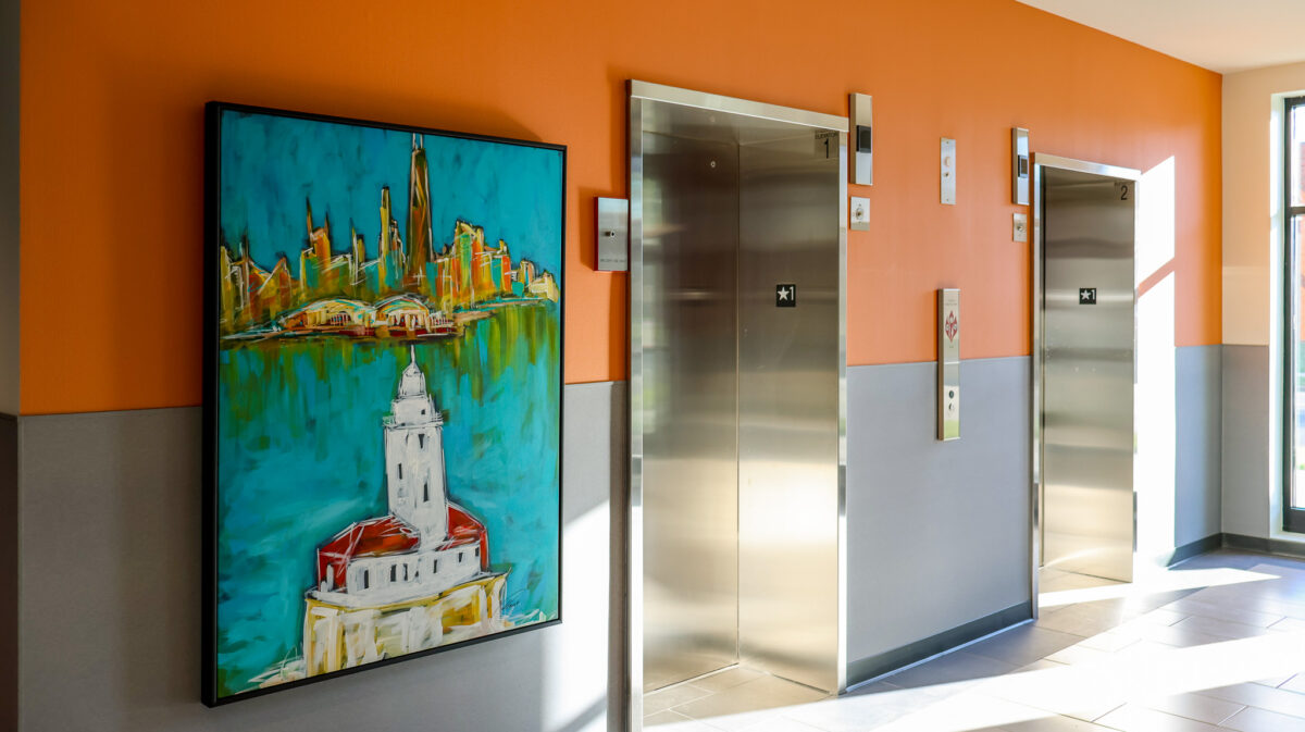 To make the residence fully accessible for its tenants, the common areas offer contrasting colors, lit braille unit signage, handrails on both sides of the corridors, braille wallpaper, braille numbering on the mailboxes, contrasting flooring in front of unit doors, and accessible elevators with audible signals. Additionally, the property has black light switches, outlets, and window controls to contrast with white walls throughout.