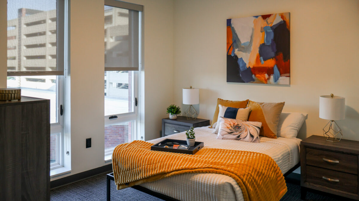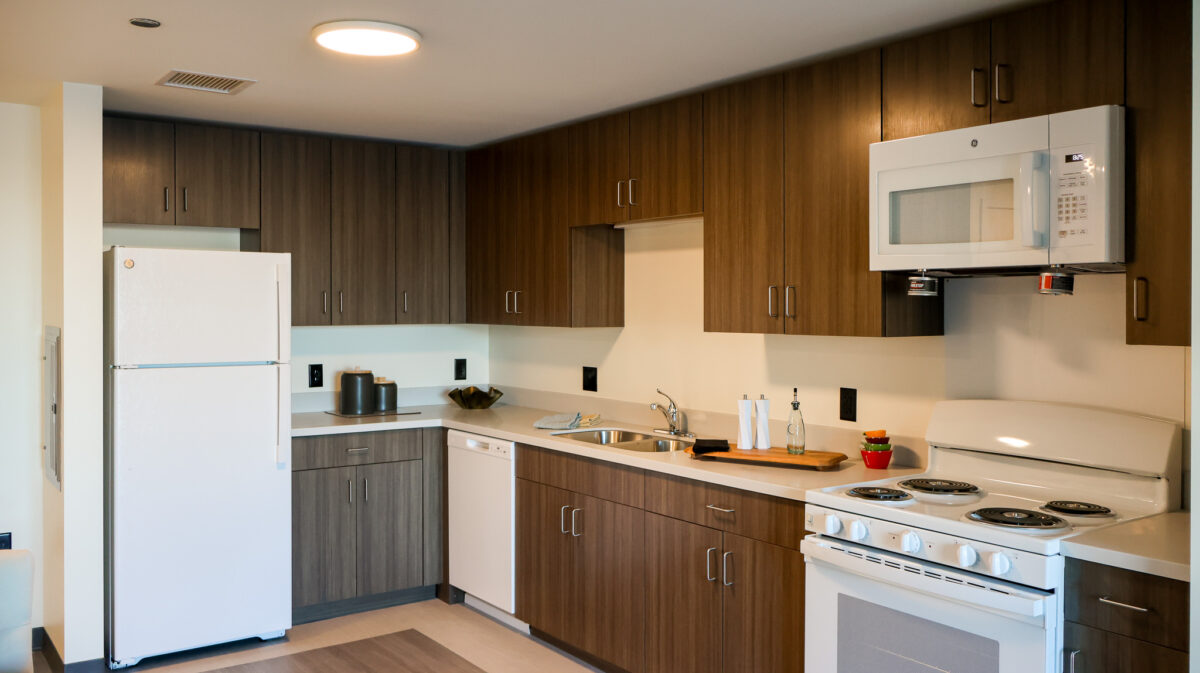 Additionally, there is contrasting flooring in front of the kitchen cabinets, and the finishes for appliances, cabinets, hardware, and countertops were selected to provide higher contrast for those with limited sight. Two-bedroom units also offer in-unit washers and dryers.