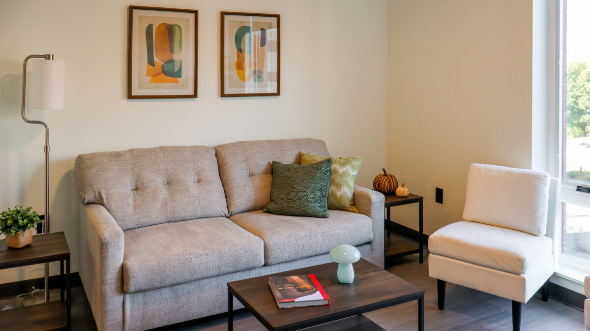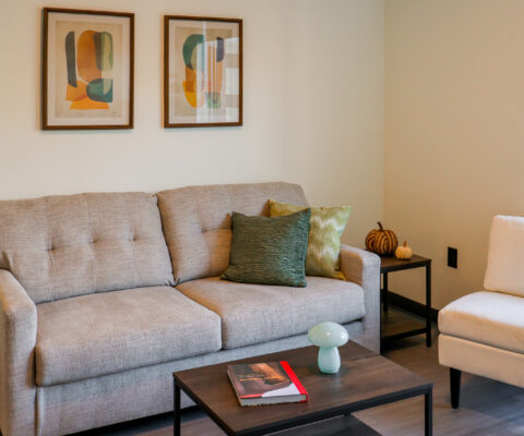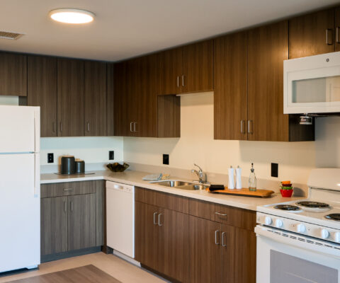 Units are offered in studio, one-, and two-bedroom floorplans that provide accessible, independent living for qualifying low-income households. Features include solid surface kitchen countertops for added durability, Energy Star appliances with front controls and tactile operation, WaterSense plumbing fixtures, cultured marble vanities, and dimmable lighting.