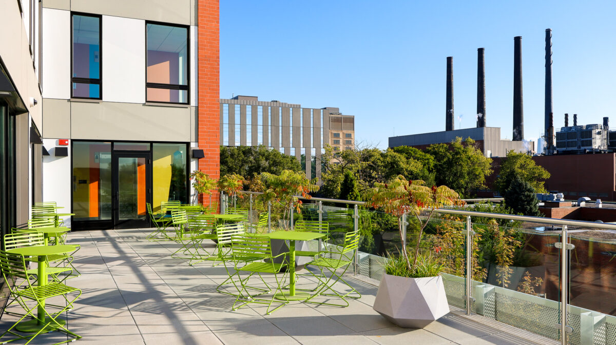 Tenant amenities include a fitness center, community room, and fourth-floor rooftop terrace. Outside, residents can enjoy a courtyard with a dog run and a playground.
