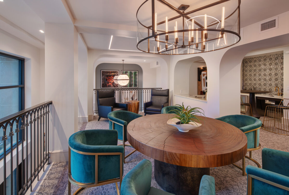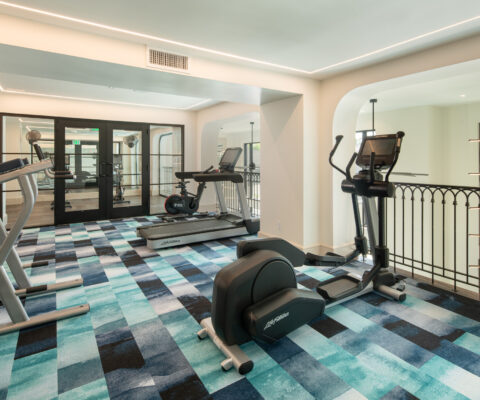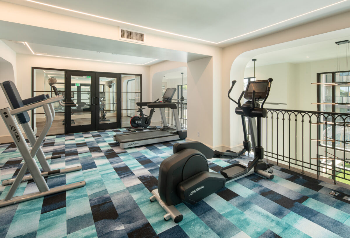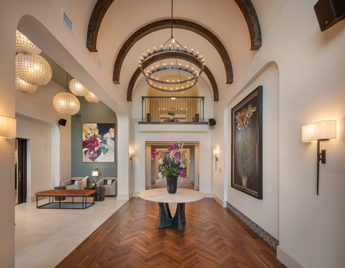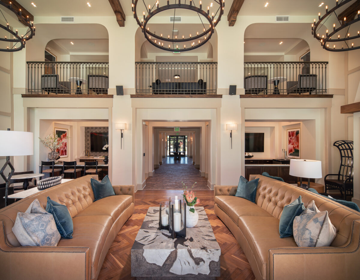 Amenities include a state-of-the-art fitness center with yoga and spin rooms, a wellness center with a sauna, a club room kitchen, and a game room with an arcade and golf simulator. Outside, residents can enjoy a resort-style swimming pool, grotto, and summer kitchens, and pet owners can take advantage of the dog park and pet spa. The community also offers electric vehicle charging stations and a smart package room with cold storage.