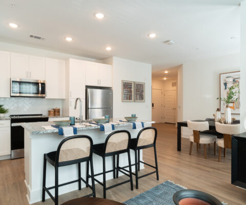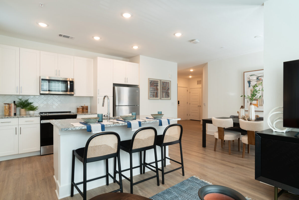 Each well-appointed unit features granite and quartz countertops, stainless-steel appliances, custom cabinetry, and luxury vinyl tile flooring. Units are offered in spacious one- to three-bedroom layouts with high ceilings and private balconies or patios.