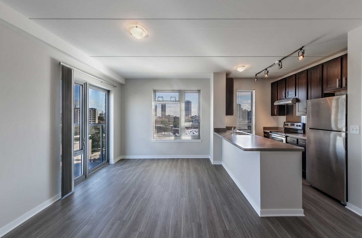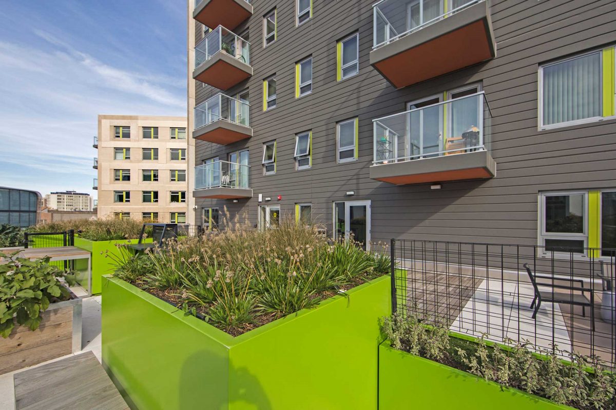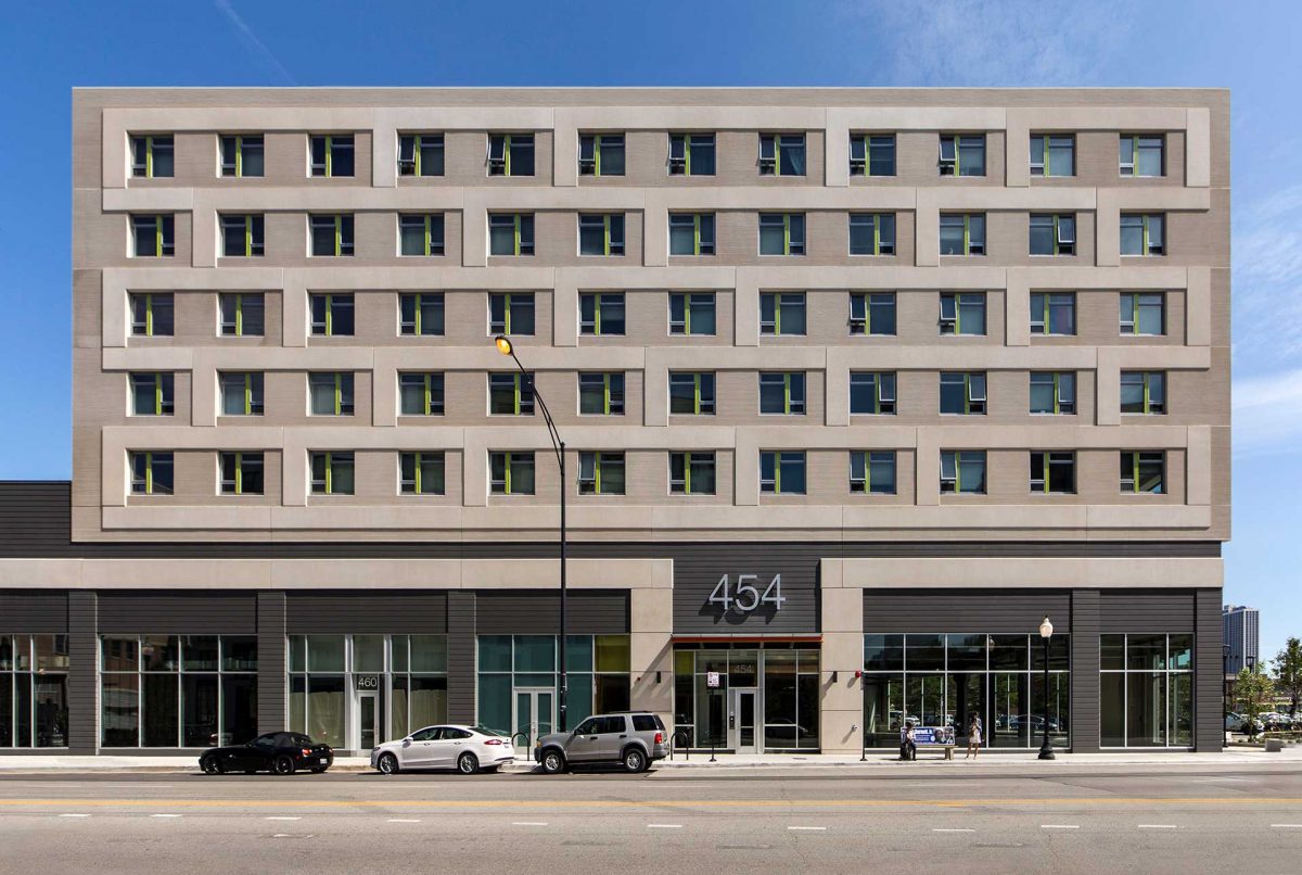The mixed-use development was constructed with precast and offers 76 parking spaces on the first two floors with a mix of 84 apartment units in studio, one, two and three-bedroom floor plans on floors three through seven.