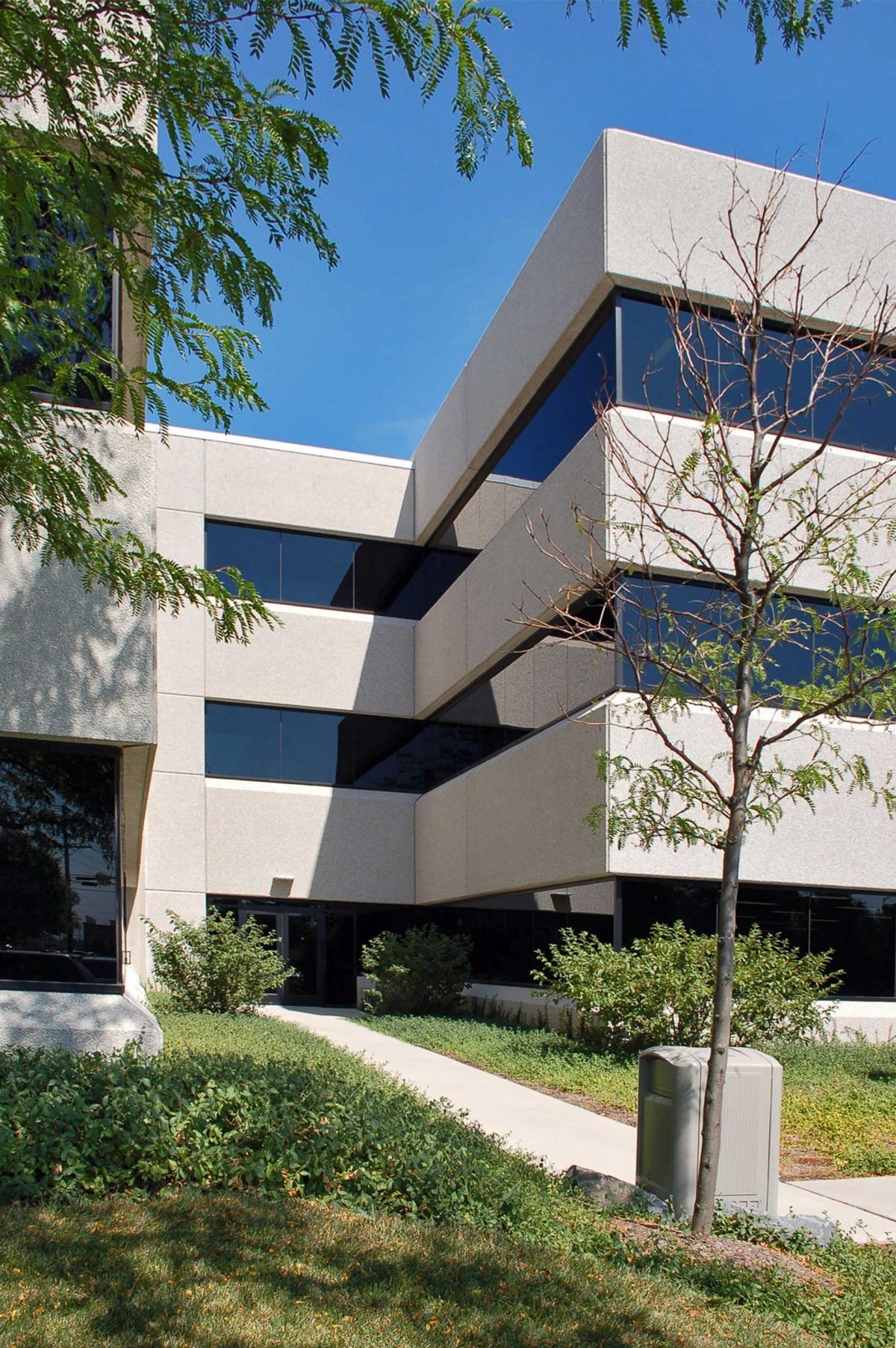 The new three-story build-to-suit office building was constructed as an addition to the firm’s existing two-building campus.