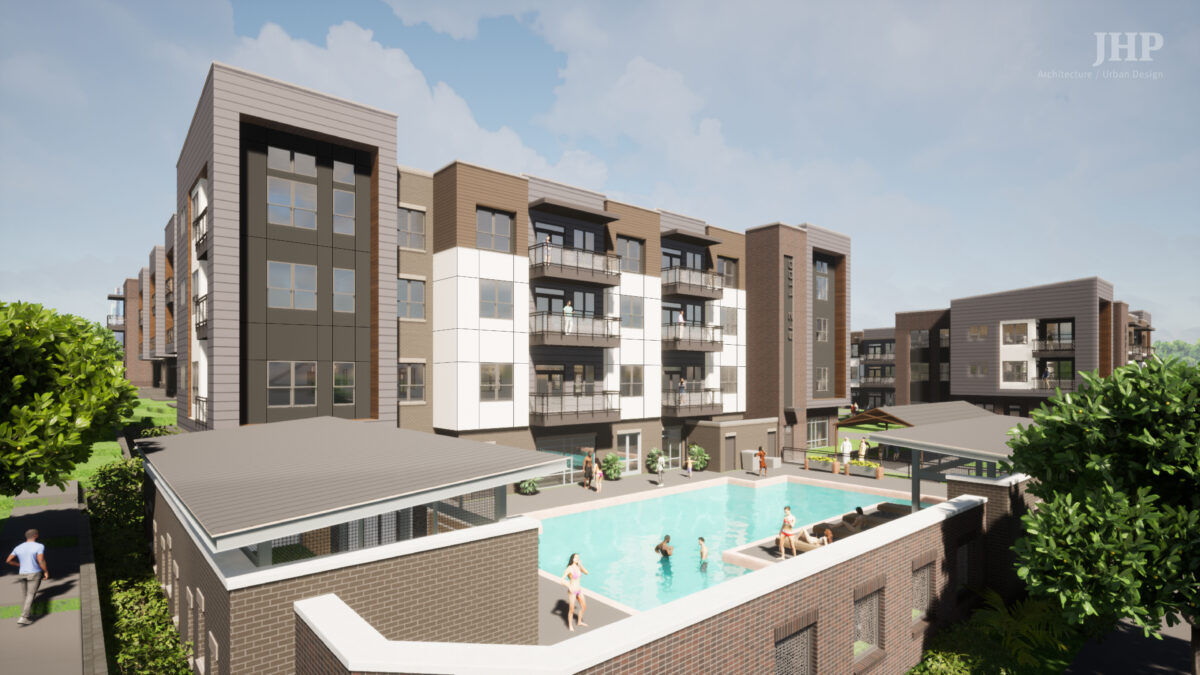 The three- and four-story building features an exterior of Hardie siding and brick masonry. The building was designed to achieve EarthCraft Gold Certification.