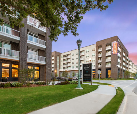 Situated on an eight-acre site, The Enzo at Ariston incorporates two four- and five-story wood frame apartment buildings with exteriors of siding and brick, along with a precast parking garage.