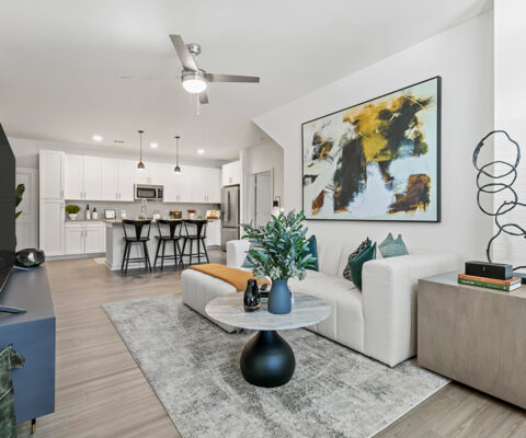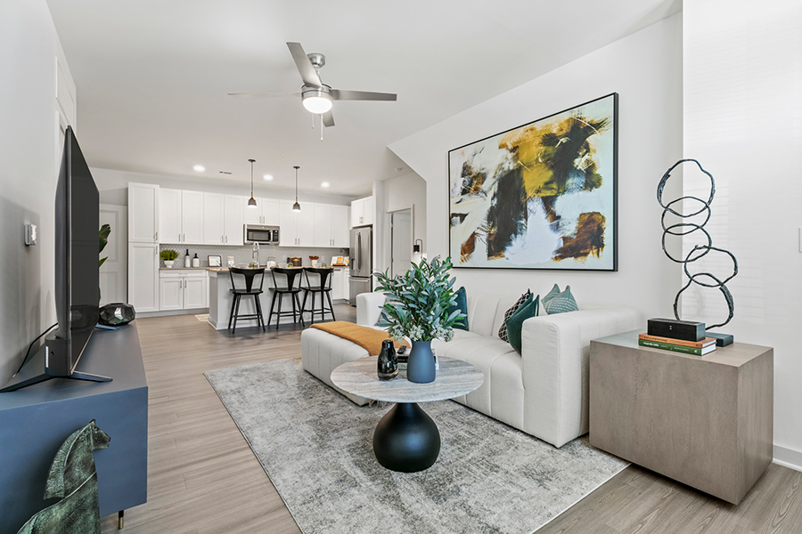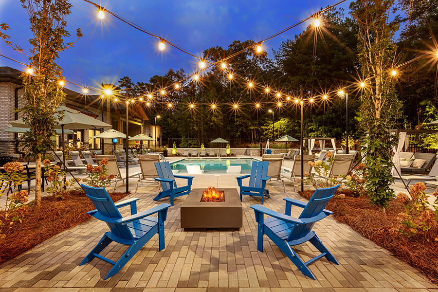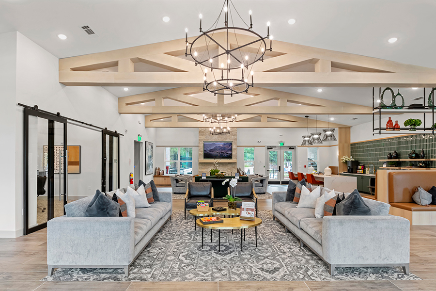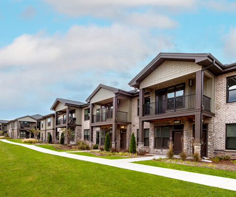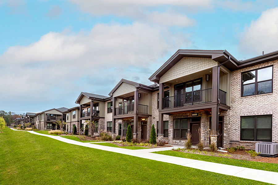 Positioned on an 18.3-acre site, the development incorporates eight two-story garden-style buildings. The wood frame buildings integrate an exterior of painted brick veneer, stone veneer, and fiber cement siding.