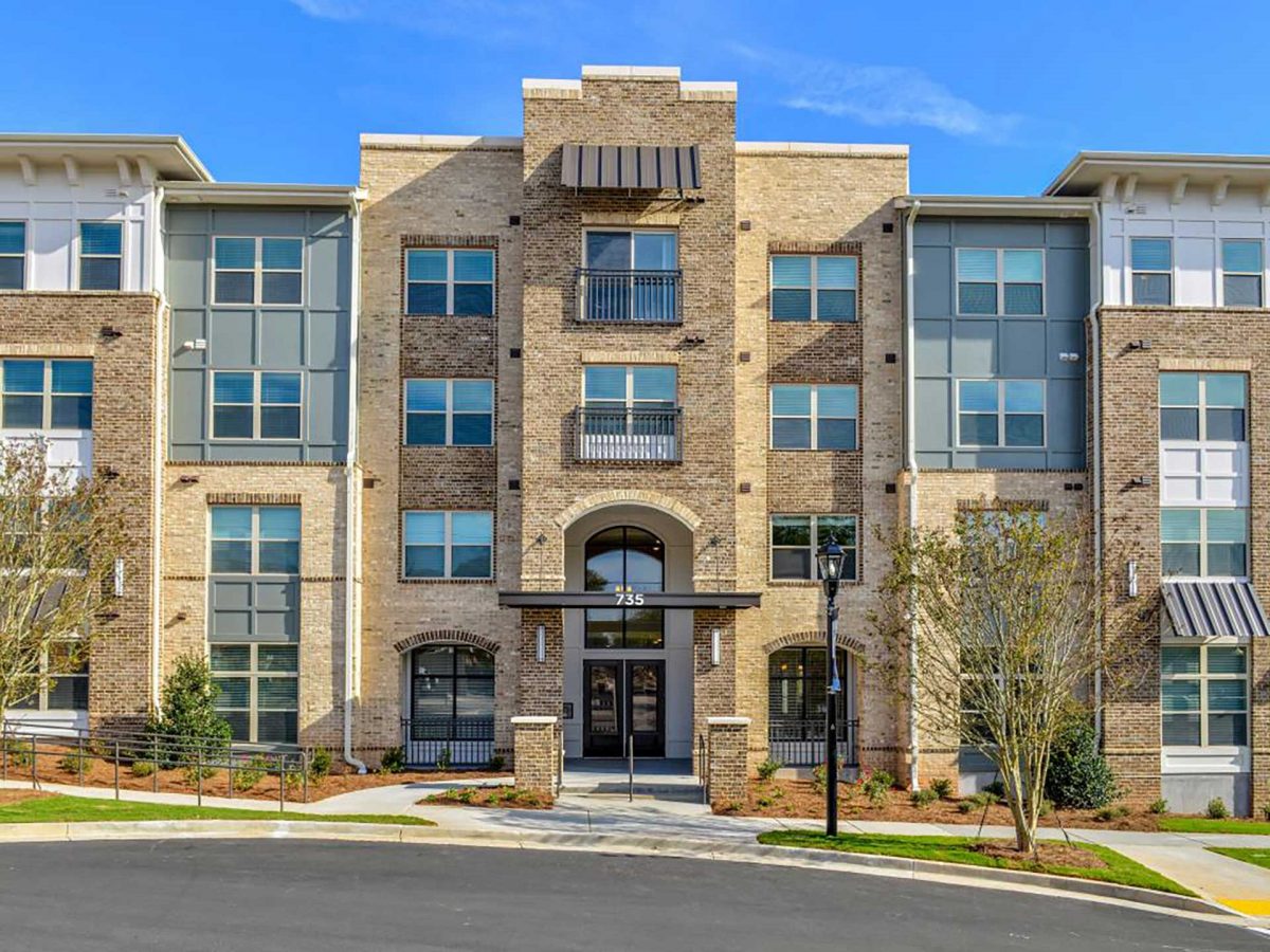 The four-story, 109,714-square-foot apartment building features 102 units in one- and two-bedroom floor plans within a wood frame structure wrapped with brick and fiber cement panels.